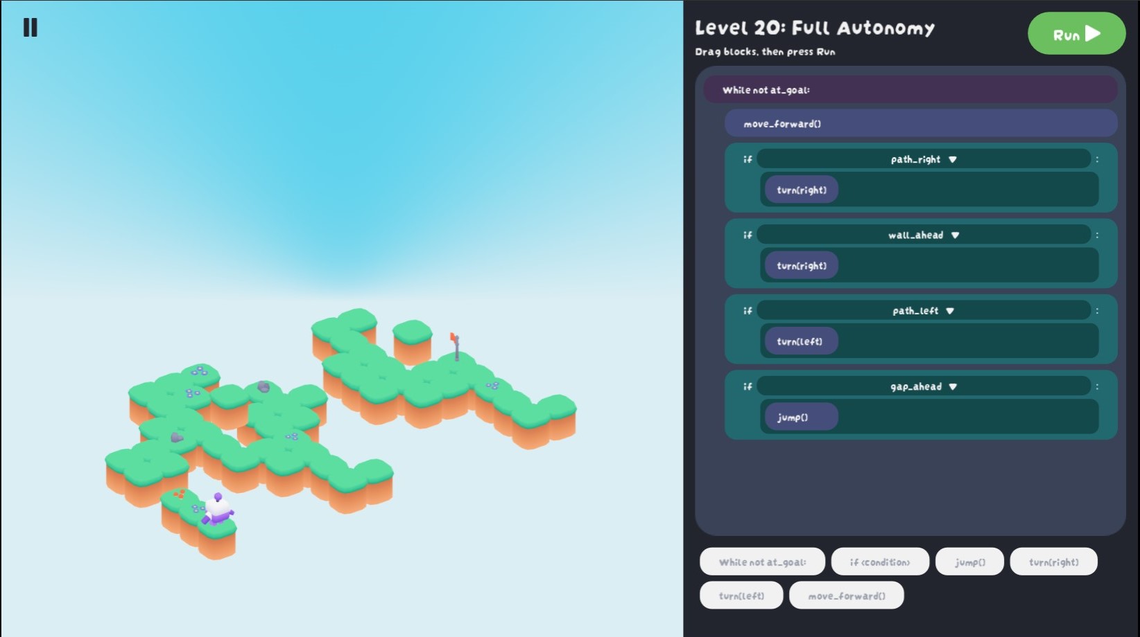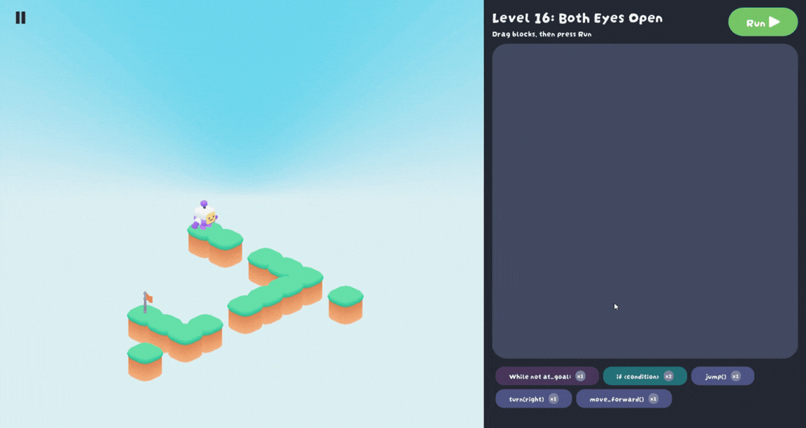 I love the lowpolly graphics, I was about to say the game was too easy but then I realiza I was wrong, it gets complicated moving forward when you add more functions, the "run" button for some reason only works by clicking on it left side
